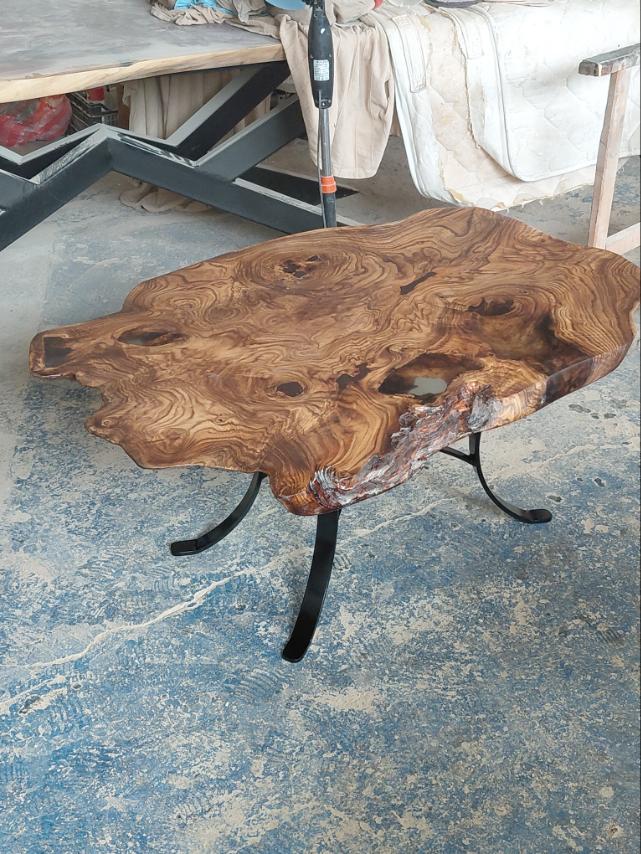 The table top rests on minimalist black steel legs — blending rustic artistry with modern balance.