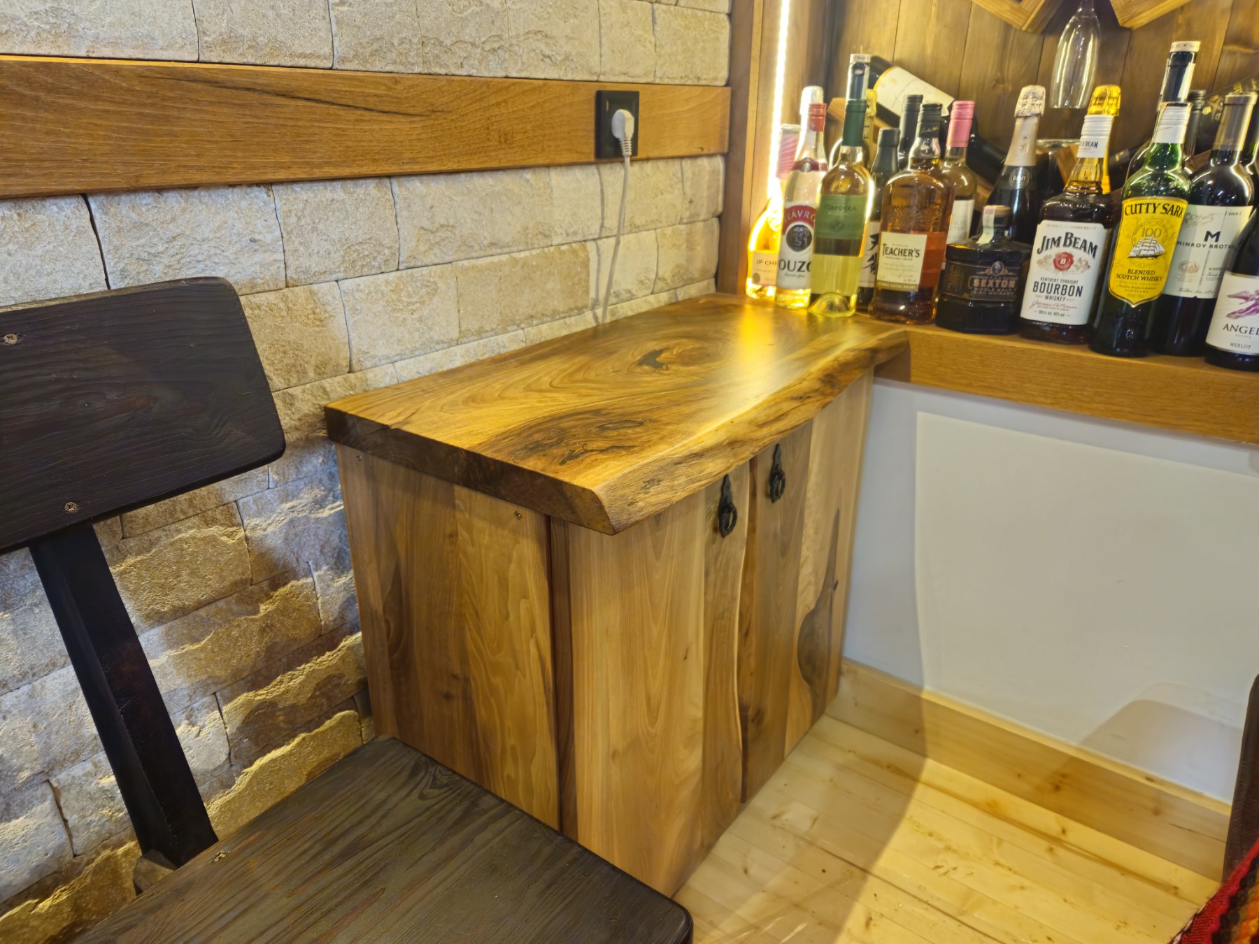 The thick 45mm walnut top creates a premium surface for serving, while the cabinet below keeps bottles and bar essentials neatly organised. Ideal for cosy home bars, kitchens, studios, and modern rustic interiors.